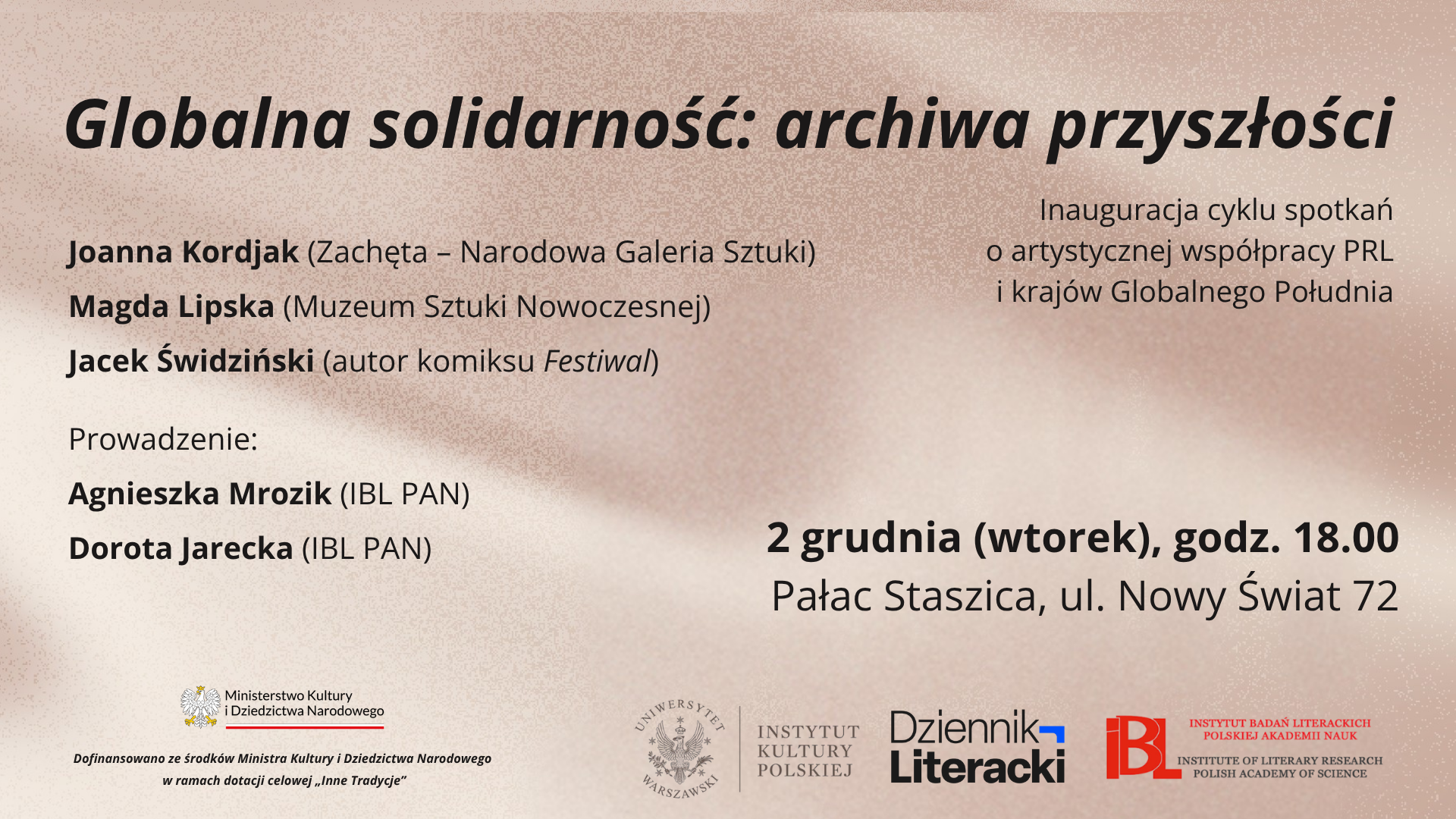Interdyscyplinarna Grupa Badawcza “PRL i Globalne Południe” w Instytucie Badań Literackich PAN oraz „Dziennik Literacki” zapraszają na spotkanie inaugurujące cykl „Globalna solidarność: archiwa przyszłości” 2 grudnia (wtorek), godz. 18.00, Pałac Staszica, ul. Nowy Świat 72, sala 144 (I piętro).