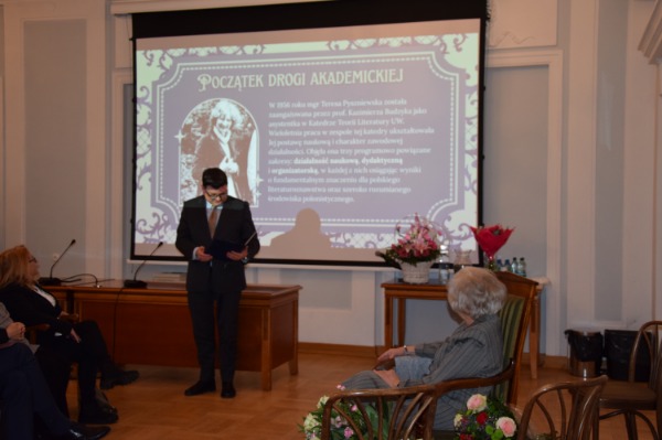 Pani Profesor Kostkiewiczowa, autorka syntez akademickich oraz publikacji z historii literatury oświecenia i teorii literatury polskiej, doktor honoris causa Uniwersytetu Warmińsko-Mazurskiego w Olsztynie (2004) i Katolickiego Uniwersytetu Lubelskiego Jana Pawła II (2011), od ponad pół wieku jest zaangażowana w życie naukowe Instytutu, m.in. w prace redakcyjne „Pamiętnika Literackiego” oraz w organizację Olimpiady Literatury i Języka Polskiego. Ukierunkowuje interdyscyplinarne przedsięwzięcia towarzystw naukowych (Towarzystwo Literackie im. Adama Mickiewicza, Towarzystwo Naukowe Warszawskie, International Society for Eighteenth-Century Studies / La Société internationale d'étude du dix-huitième siècle, Polskie Towarzystwo Badań nad Wiekiem Osiemnastym) oraz środowisk humanistycznych w Polsce i poza jej granicami. Opracowania naukowe Jubilatki nie przestają inspirować badań nad literaturą polską, postrzegane jako wzór doskonałego warsztatu naukowego, wnikliwości badawczej oraz twórczego dialogu z dorobkiem kultury europejskiej i nowoczesną metodologią. Dorobek naukowy Pani Profesor Teresy Kostkiewiczowej oraz jej aktywność zawodowa, odpowiadająca najwyższym standardom etycznym, przynależą do najlepszych tradycji polskiego literaturoznawstwa. Dzięki niezwykłej osobowości Pani Profesor oraz zgromadzonym gościom – naukowcom, przyjaciołom Pani Profesor i obecnej na Jubileuszu rodzinie – uroczystość nabrała szczególnego charakteru.