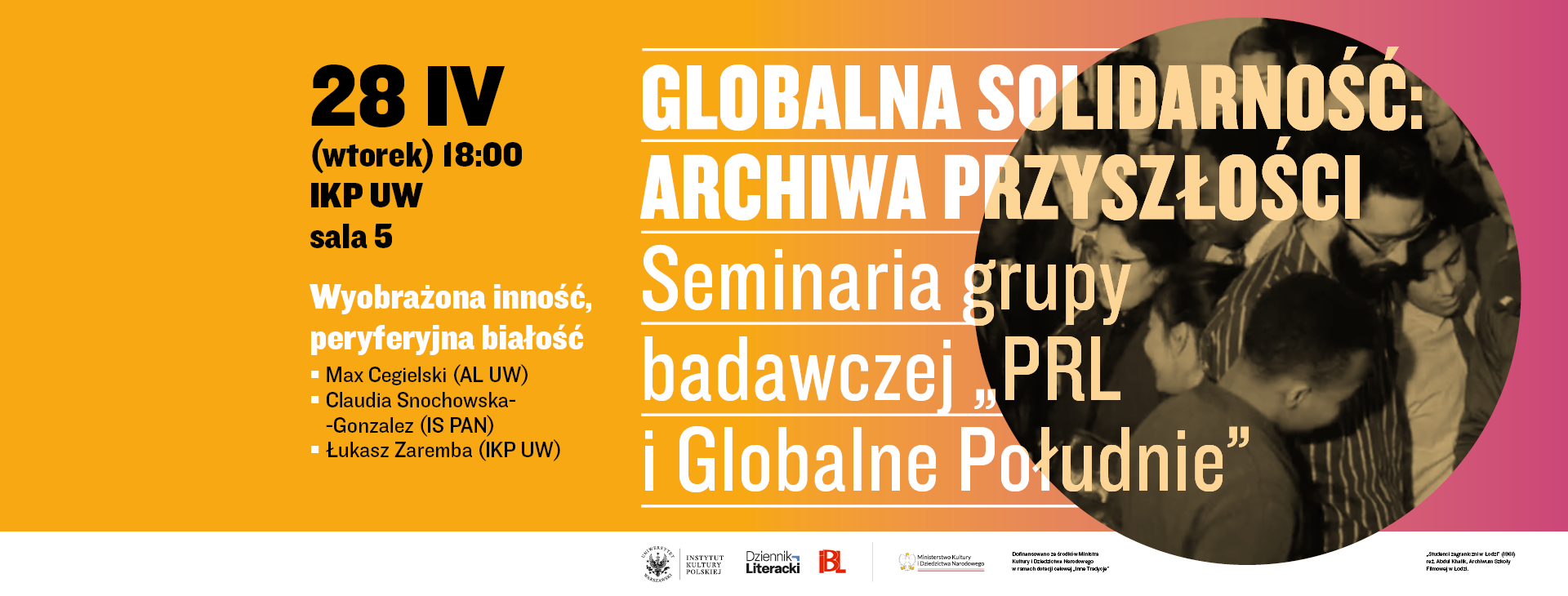 Serdecznie zapraszamy na pierwsze wiosenne seminarium z cyklu „Globalna solidarność: archiwa przyszłości”, zatytułowane „Wyobrażona inność, peryferyjna białość”. Spotkanie odbędzie się 28 kwietnia (wtorek) o godz. 18.00, Instytut Kultury Polskiej UW, sala 5.